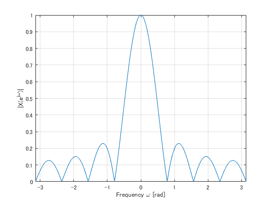 %プログラム MATLAB2.3 の補足 %(離散時間フーリエ変換の振幅スペクトルと位相スペクトル) w = -pi:0.01:pi; %周波数の範囲 x = 1/8*[1 1 1 1 1 1 1 1]; %離散時間信号 X = freqz(x,1,w); %離散時間フーリエ変換 figure(1) plot(w,abs(X)); %振幅スペクトルの図示 axis([-pi pi 0 1]); grid; xlabel('Frequency \omega [rad]'); ylabel('|X(e^{j\omega})|'); figure(2) plot(w,angle(X)); %位相スペクトルの図示 axis([-pi pi -pi pi]); grid; xlabel('Frequency \omega [rad]'); ylabel('\angle X(e^{j\omega})');